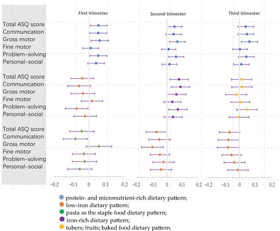 In the second trimester, women with iron-rich dietary pattern scores had children with high total ASQ scores and communication and problem-solving scores (β = 0.078, 95% CI: 0.018, 0.138); (β = 0.088, 95% CI: 0.027, 0.148); and (β = 0.071, 95% CI: 0.011, 0.131).