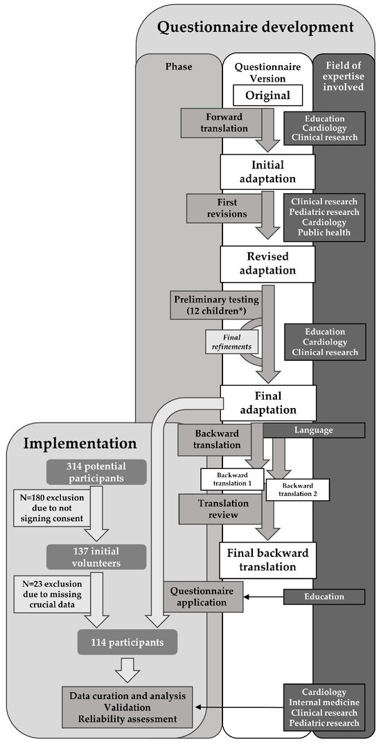 A preliminary pilot sample was analyzed to detect potential issues regarding the clarity of the questions and identify and rectify ambiguities, complex wording, or confusing questions that could potentially lead to inconsistent responses. Twelve participants and their parents were selected for this endeavor. Participants were chosen outside the school to avoid influencing the target population. In addition, the responders in the pilot sample fell into a broader age interval (8 to 17) to ensure the clarity of our surveys across multiple comprehension levels. The sample size for the preliminary survey was determined based on authoritative sources within the field [44,45]. Reflecting on the insights of Sheatsley P., whose seminal contributions to questionnaire design are well regarded, identifying primary issues and shortcomings in a trial questionnaire generally requires between 12 and 25 participants [46]. After repeated consultations with members of the pilot sample, which were conducted to resolve any potential sources of misinterpretation in the surveys, the final versions of the questionnaires were approved by the expert committee and sent for backward translation.