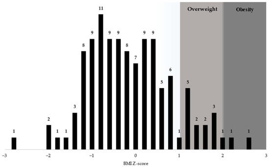 BMI Z-scores were normally distributed among the students enrolled, with a mean of −0.24 and a standard deviation (SD) of 0.98. Of the studied sample, 15 children (13.2%) had a BMI Z-score above one. Within this subgroup, 13 children (11.4% of the total 114) were overweight, and 2 students were obese (1.75% of the total). The distribution of BMI Z-scores for the students enrolled as well as weight status classification within the distribution are presented in Figure 2.