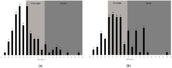 BMI distribution of (a) mothers and (b) fathers of students enrolled.
