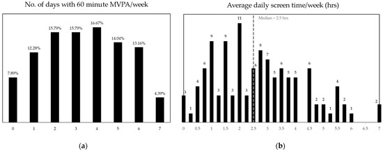 Distribution of weekly MVPA (a) and average daily screen time (b).