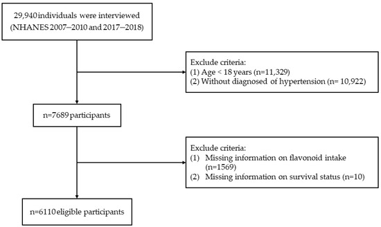 We identified a total of 29,940 individuals from 3 survey cycles (2007–2008, 2009–2010, and 2017–2018) of NHANES data. Exclusions were made for individuals under 18 years old (n = 11,329), those without HTN (n = 10,922), those lacking flavonoid dietary data (n = 1569), and without information from survival status (n = 10). Finally, the study enrolled 6110 participants (Figure 1). The diagnosis of HTN included fulfilling one of the following conditions: (i) a history of HTN; (ii) being on an antihypertensive regimen; (iii) with an average SBP ≥ 140 mmHg or average DBP ≥ 90 mmHg [22]. The National Center for Health Statistics (NCHS) Research Ethics Review Board approved the NHANES protocol [23]. All participants signed informed consent.
