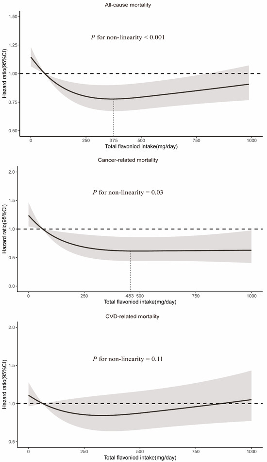 Dose–response relationships between total flavonoid intake and all-cause and cause-specific mortality. Median total flavonoid intake is reference standard. Hazard ratios are based on Cox proportional hazards models adjusted for age (continuous, years), sex (female and male), race (White, Black, Hispanic, Mexican American, and others), marital status (without partner and with partner), education status (<9 years, 9–12 years, and >12 years), activity (vigorous, moderate, and inactive), smoking status (never, former, and current), alcohol intake (continuous, g/d), BMI (continuous, kg/m2), daily energy intake (continuous, kcal/d), total fruit intake (continuous, cup/d), total vegetable intake (continuous, cup/d), whole grains intake (continuous, oz/d), and red meat intake (continuous, oz/d). Solid lines indicate HR and shadows indicate 95%CI.