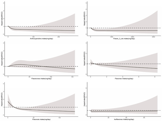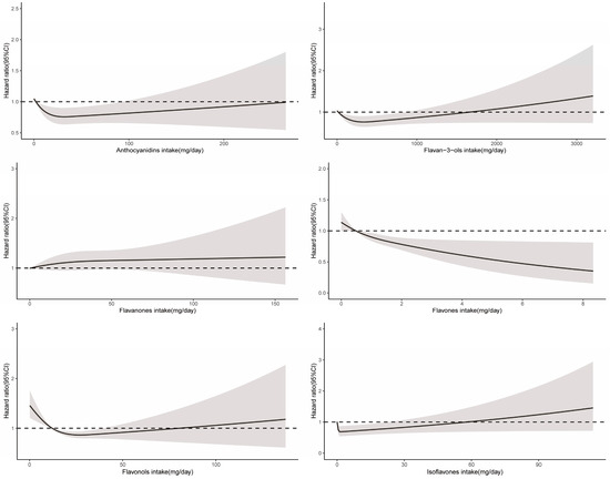Dose–response relationships between flavonoid subclass intake and all-cause mortality. Median flavonoid subclasses intake is reference standard. Hazard ratios are based on Cox proportional hazards models adjusted for age, sex, race, marital status, education status, activity, smoking status, alcohol intake, BMI, daily energy intake, total fruit intake, total vegetable intake, whole grains intake, and red meat intake. Solid lines indicate HR and shadows indicate 95%CI.