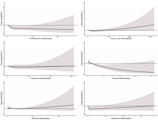 Dose–response relationships between flavonoid subclass intake and CVD-related mortality. Median flavonoid subclasses intake is reference standard. Hazard ratios are based on Cox proportional hazards models adjusted for age, sex, race, marital status, education status, activity, smoking status, alcohol intake, BMI, daily energy intake, total fruit intake, total vegetable intake, whole grains intake, and red meat intake. Solid lines indicate HR and shadows indicate 95%CI.