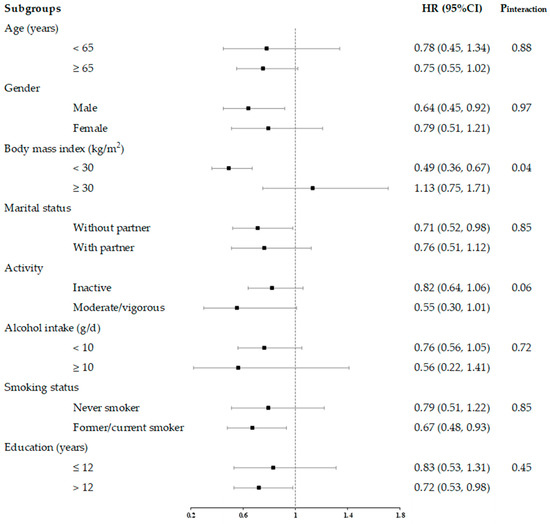 Furthermore, we conducted stratified analysis by several key risk factors, including age (<65, ≥65 years), sex (male, female), BMI (<30, ≥30 kg/m2), marital status (without and with partner), activity (inactive and moderate/vigorous), alcohol intake (<10, ≥10 g/day), smoking status (never and former/current smoker), and education status (≤12 and >12 years) by incorporating an interaction term into the completely adjusted model. The interaction was tested in these stratified variables by the likelihood-ratio test.