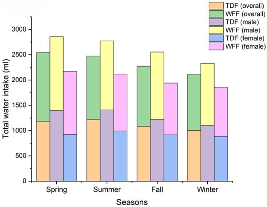Fluid intake behaviors may also vary according to seasons, especially the volume and the composition of TWI. The results of MANOVA showed significant differences in TDF (F(2.62) = 9.36, p < 0.001), WFF (F(2.61) = 17.21, p < 0.001), and TWI (F(2.37) = 42.29, p < 0.001) across the four seasons. TDF in summer (1219 ± 502) was significantly higher than in fall (1082 ± 475, p = 0.015) and winter (1082 ± 475, p = 0.009) but did not significantly differ from that in spring (1182 ± 594, p = 1.000). As results from GEE analysis showed, when controlled for gender, summer (β = 236.1, p < 0.001) had the leading β among all seasons with winter as the reference. The β of spring and fall were 178.7 (p < 0.001) and 79.0 (p = 0.018), respectively. Consistent with our findings, Malisova et al. [] concluded that there was no significant difference in the water balance between summer and winter among Greek residents, while TDF was significantly higher in summer than in winter, and the proportion of WFF in winter outran that in summer.