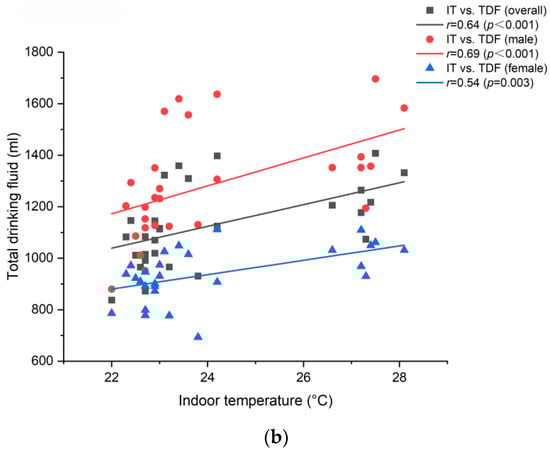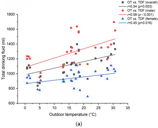 Correlational coefficients of drinking fluid and environmental factors derived from Spearman rank correlation are listed in Table 6. We found that outdoor and indoor temperatures were significantly associated with TDF, volume consumed each time, and plain water intake. MT and ΔT were also associated with TDF. No significant correlation between temperatures and the frequency of fluid intake was found for the overall population, but moderate correlations were found when analyzing the average frequency of male and female participants separately. However, beverage intake had a stronger association with indoor temperature than outdoor temperature. Most of the correlational coefficients exhibited gender differences. Participants’ TDF, frequency of fluid intake, volume consumed each time, and plain water intake tended to increase as indoor and outdoor temperatures climbed. Scatter plots of temperature and total drinking fluid, as shown in Figure 2, were also built to visualize the correlation between environmental factors and the fluid intake behavior of participants.