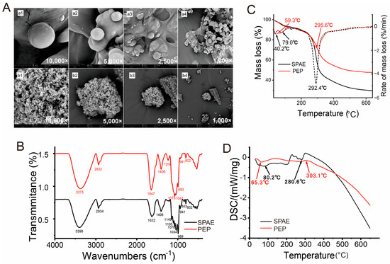 Characterization of the SPAE and PEP. (A) Scanning electron micrographs (a1–a4: SPAE, b1–b4: PEP). (B) FTIR spectra. (C) TGA–DTG curves. (D) DSC curves.