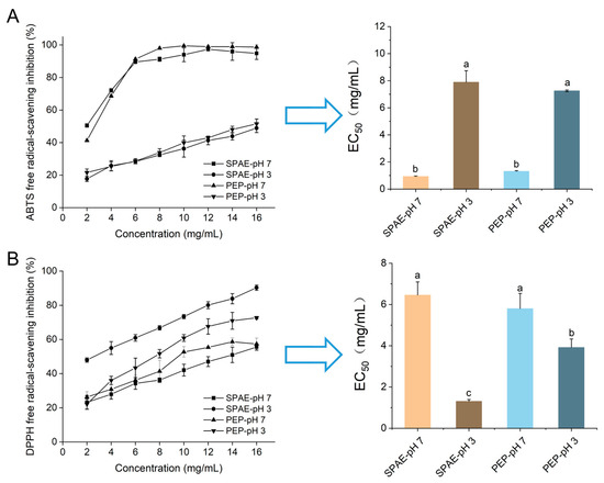 The ABTS radical and DPPH radical scavenging activities of SPAE and PEP were determined according to previously reported methods [20], and, finally, the concentration of the samples required to achieve a scavenging rate of 50% was calculated, namely, EC50 value.