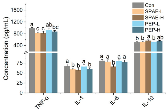Effects of SPAE and PEP on inflammatory parameters in serum of mice. The use of lowercase letters indicates significant differences among the treatment groups at a significance level of p < 0.05.