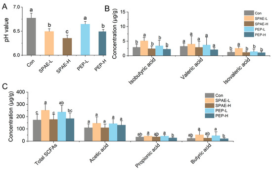 SCFAs are produced by the intestinal microbiota through the degradation of polysaccharides, resulting in pH reduction and affecting intestinal microbiota composition [5]. SCFAs are crucial for the host’s metabolism and immune system [36]. As shown in Figure 4A, the intestinal pH of SPAE-H was the lowest at 6.35, followed by SPAE-L (6.49), which were significantly lower than Con group (p < 0.05). SPAE groups always had a lower pH value than that of PEP groups under the same conditions. The results indicated that SPAE supplementation produced SCFAs and other products, leading to a lower pH. Previous studies have demonstrated that a weakly acidic condition could stimulate beneficial bacteria growth while inhibiting harmful bacteria proliferation [37].