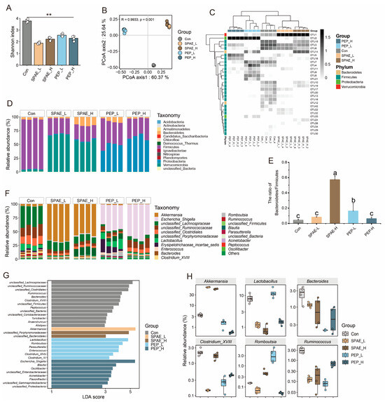 Effects of SPAE and PEP on gut microbiota composition analysis. (A) α diversity analyzed by Shannon index. (B) β diversity analyzed by PCoA. (C) OTU level of gut microbiota. (D) Phylum level of gut microbiota. (E) The ratio of Bacteroidetes and Firmicutes. (F–H) Genus level of gut microbiota. The use of “**” indicates significant differences among the treatment groups at a significance level of p < 0.01. The use of lowercase letters indicates significant differences among the treatment groups at a significance level of p < 0.05.