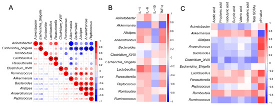 Relationship between inflammatory parameters, SCFAs, and gut microbiota. (A) Correlation analysis of gut microbiota at genus level. (B) Heatmap of the correlation coefficients between inflammatory parameters and gut microbiota at genus level. (C) Heatmap of correlation coefficients between SCFAs and gut microbiota at genus levels. The use of “*” indicates significant differences among the treatment groups at a significance level of p < 0.05.