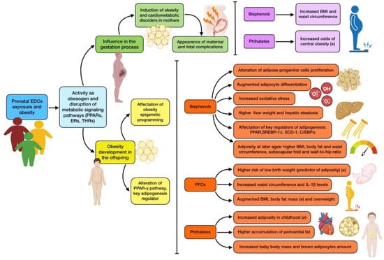 EDCs are known to disrupt important metabolic signaling pathways, such as PPARs, estrogen receptors (ERs), and thyroid hormone receptors (THRs), as well as to operate as obesogens, which are compounds that can change energy balance by encouraging adipogenesis and fat buildup, even during the gestation process. This obesogenic effect might be associated with two detrimental consequences. On the one hand, it may influence the outcome of the gestation process, as the presence of obesity, diabetes, and cardiometabolic conditions during pregnancy is widely associated with the appearance of maternal and fetal complications [73,74], and exposure to EDCs is one of the risk factors for the appearance of such comorbidities. On the other hand, it may also be related to obesity development in the offspring [75].