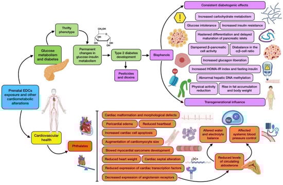 On the other hand, a human cohort involving 1300 children has also been studied to explore the relationship between parental EDC exposure and congenital heart defects. Maternal occupational exposure to PAEs seemed to be related to perimembranous ventricular septal defect (PmVSD), secundum atrial septal defect (s-ASD), patent ductus arteriosus (PDA), and pulmonary valve stenosis (PS). As for paternal occupational PAEs exposure, it seemed to be associated with both PmVSD and PS [106]. These results support, through human-based research, the consistent evidence provided by animal studies on the risk that exposure to EDCs (and especially phthalates) represents for the development of cardiovascular disorders. The most relevant effects produced by prenatal EDC exposure on both diabetes and cardiometabolic health are shown in Figure 3.