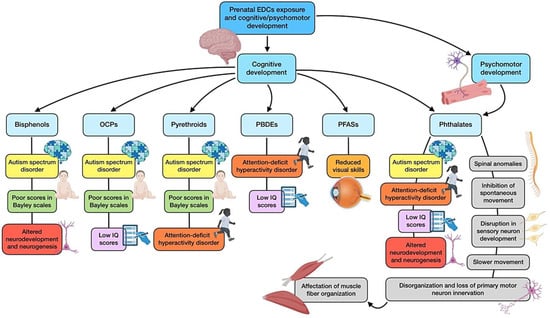 Some studies have addressed psychomotor development and function in relation to EDC exposure, although research has been mainly focused on zebrafish models. Embryonic exposure of these animals to DEHP and DBP was found to significantly produce spinal anomalies, with spine curvatures and inhibited spontaneous movement. These phthalates seemed to alter the expression of genes associated with the development of the notochord, skeleton, and muscle, dampening the locomotor activity of larvae at 144 h post fertilization [70]. The most recent study investigating DBP’s involvement in motor and sensory neuron alterations supported these findings, as it showed that post fertilization administration induced disorganization and loss of primary motor neuron innervation of somatic tissue, which was accompanied by affectation of muscle fiber organization. Moreover, disruptions in sensory neuron development were also discovered, which included impairment in dorsal root ganglion and its peripheral axons, as well as loss of the bilateral soma positioning along the spinal cord and its afferent projections [71]. In other studies, psychomotor alterations have been translated to impaired behavioral patterns, including a reduction in total distance traveled and slower movement. Kim and colleagues [72] associated the impairments with inhibition to dopamine synthesis, together with an imbalance between inhibitory and excitatory neurotransmission. The effects of prenatal exposure on this matter have also been reported for several more phthalates (including DMP, DEP, DEHP, DNOP, and BBP), with spinal curvature and abnormal movement of these animals [49]. Finally, limited rodent research has provided relevant evidence on psychomotor impairments, highlighting a study in which gestational rats were exposed to DBP. This intervention resulted in a considerable incidence of skeletal alterations in fetuses, while neonates showed poor scores in sensory and motor development. In addition, some of these defects seemed to be multigenerational [128]. With regard to other EDCs, perinatal exposure to nonylphenol has been associated with delayed myelination in the newborn cerebellum, even though this situation can be recovered over time and returned to normal in adulthood [32]. Figure 4 shows a summary of the main alterations derived from prenatal exposure to EDCs on cognitive and psychomotor development.