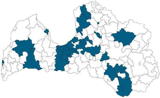 Map of Latvia. Regions where samples were collected are marked in blue (n = 116).