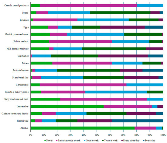 Breakfast cereal, white wheat pasta, white rice, oat flakes, and buckwheat were the most commonly consumed food products from the cereals and cereal products group—consumed on average once a week. Rye bread, sourdough bread, and seed bread were mostly consumed twice a week, but the average intake frequency for wheat bread was “once a week”. Poultry and pork, on average, were consumed once a week, but beef and meat products (sausages, ham, etc.) were mostly consumed less than once a week. The participants reported that they consumed fish only once a week. Milk, cheese, and sour cream were the most commonly consumed milk products, on average being consumed twice a week. Participants, on average, noted fresh vegetable consumption every other day, but fresh fruit and berry intake was two times a week. Pulses were consumed only rarely. Vegetable oils were the most commonly used plant-based fats, being used every other day. Butter was the most commonly consumed condiment, but chocolate was the most frequently consumed product from the sweets and bakery goods category; both products, on average, were consumed twice a week by the participants. Different salty snacks (chips, salty nuts) and fast food (pizza, hot dogs, etc.) were consumed only rarely, at less than once a week. Lemonades and alcohol were not consumed at all or only rarely. Coffee was the most commonly consumed caffeine-containing drink, being consumed daily by 52% of study participants.