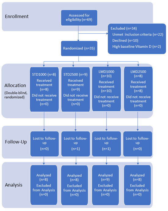 In view of these findings, the goal of this (follow-up) pilot study was to compare micellar Vitamin D3 (i.e., LMD) with standard Vitamin D3 (i.e., STD), both formulated in a liquid (oil-based) softgel capsule, regarding their pharmacokinetic and safety profile in healthy adults following daily oral administration at dosages of 1000 IU and 2500 IU. Thereafter, the pharmacokinetics with respect to AUC and Cmax of serum circulatory 25-hydroxyvitamin D (25(OH)D), as well as 1,25-dihydroxyvitamin D (1,25(OH)2D) levels along with safety markers including mineral levels, were monitored over 60 days.