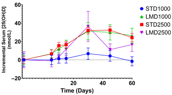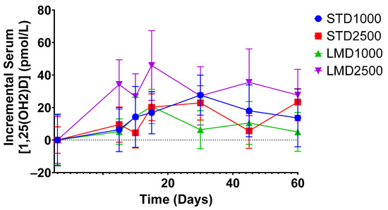 As highlighted in Figure 2, the LMD1000 treatment group showed comparable average serum concentrations of 25(OH)D to the higher dosing STD2500 group, when measured incrementally. Additionally, changes in serum 1,25(OH)2D concentrations were monitored over 60 days; no significant differences were detected among the treatment groups when compared at the same dosages (Table 3; Figure 3 and Figure 4b).