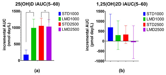 Increase in serum (a) 25(OH)D and (b) 1,25(OH)2D concentrations over the 60-day study period. Incremental Area Under Curve (iAUC) values obtained from subtraction of baseline values for each participant at various time points were evaluated. Mean ± SEM; * denotes p ≤ 0.05 using the Mann–Whitney test with Holm–Šídák multiple comparison correction; ns denotes “not significant”.