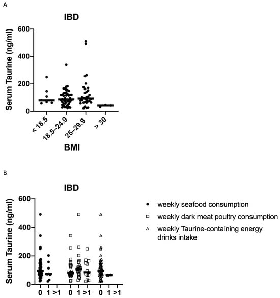 Serum taurine levels in subgroups of IBD patients according to their body mass index (BMI) (A), weekly consumption of seafood and dark meat poultry, and weekly intake of taurine-containing energy drinks (0 = 0 times a week, 1 = once a week and >1 = more than once a week) (B). Each point in the graph indicates the level of taurine in the serum sample of a single patient, while the horizontal bars indicate the median value for each group.