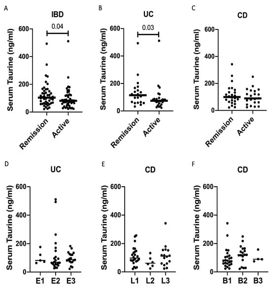 The serum taurine levels were significantly reduced in IBD patients with clinically active disease compared to those in remission (Figure 4A). However, when patients were stratified according to the IBD type, a significant difference between patients with clinically active disease and those in remission was confirmed in UC but not in CD (Figure 4B,C). Finally, the taurine levels were not influenced by disease extent in UC, and by disease localization and phenotype in CD (Figure 4D–F).