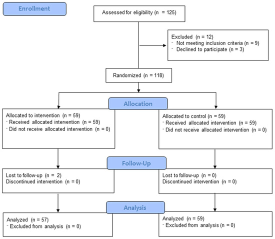 Participant allocation was conducted through a computer-generated random number system, evenly distributing subjects between the experimental group (EG) and the control group (CG) while maintaining a 1:1 ratio. Group assignment was blinded to participants, investigators, and the physiotherapist responsible for the intervention. For this purpose, opaque, sealed envelopes with sequential numbering were used, stored in a secure location accessible only to an individual not directly involved in the research. Once this phase was completed, 59 individuals were placed in the experimental group and another 59 in the control group.