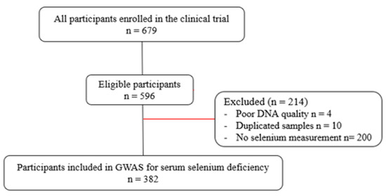 This observational, cross-sectional study was conducted at the Ribeirão Preto Medical School, University of São Paulo, Brazil. Participants were volunteers from the Metropolitan Region of Ribeirão Preto, Southeastern Brazil. They were adults of both sexes, in all classes of Body Mass Index (BMI), and clinically stable. Patients taking multivitamins and mineral supplements, in use of antibiotics or other medications that are metabolized by cytochrome P4503A4 (CYP3A4), in current tobacco and alcohol consumption, athletes or individuals practicing intense physical activity, or with infectious diseases or with a diagnosis of chronic disease that may interfere with data collection were not included in the study. A total of 679 participants met the inclusion criteria. After removing patients without clinical evaluation, 596 participants were eligible. Participants with poor DNA quality, duplicated samples, and no Se measurement were also excluded, and 382 individuals were considered for analysis in the present study (Figure 1).