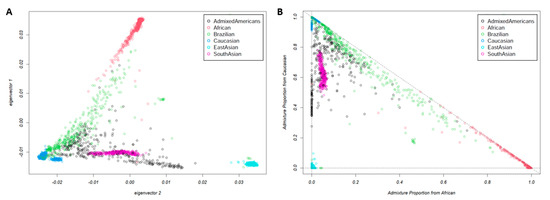 The principal component analysis (PCA) on the Brazilian population and 1000 Genome populations, including Caucasian, African, Admixed American, East Asian, and South Asian, using the complete set of 805,103 SNPs: (A) the first and second eigenvectors; (B) a linear transformation of coordinate from (A) followed by a translation, assuming three ancestral populations with surrogate samples: Caucasian, African, and East Asian. Each point represents one individual.