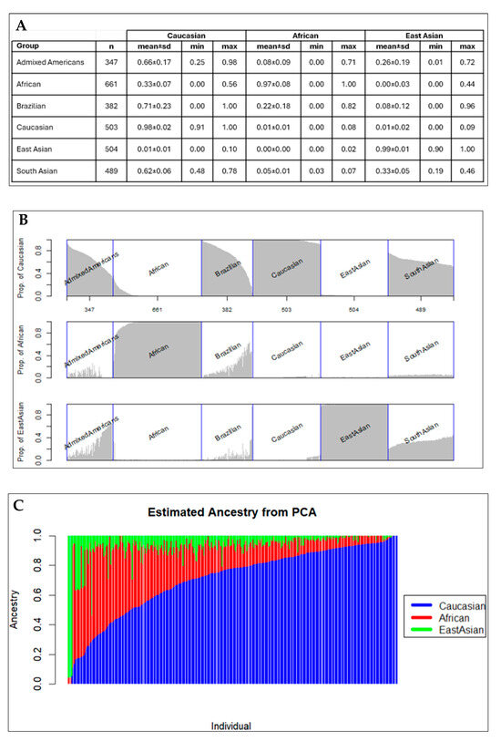 Genotype-based ancestral proportion analysis: (A) Mean and standard deviations (sd) of 3 ancestral proportions (Caucasian, African, East Asian) of the Brazilian population and the five continental level populations in the 1000 Genomes Project Phase 3 dataset (Admixed Americans, African, Caucasian, East Asian, and South Asian). (B) Graphical representation of the ancestral proportion analysis. (C) Estimated ancestry of ancestral proportion from PCA in the Brazilian population, emphasizing the ancestry of Caucasians.