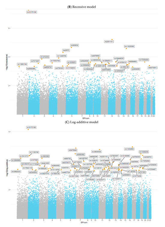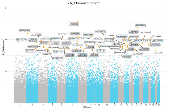 In the present genome-wide mixed-model association analysis for serum Se deficiency, no association met GWAS at a significance level of 5.0 × 10−8. Nevertheless, based on previous studies, we considered a 5.0 × 10−4 threshold as a suggestive significance level to test for genetic overlap between SNPs and Se deficiency [7,9,11,30,31,32]. Overall, mixed-model association analysis identified 57 SNPs in the dominant model (Figure 4A), 32 SNPs in the recessive model (Figure 4B), and 67 SNPs in the log-additive model (Figure 4C). The maximum-statistical analysis also identified 162 SNPs that reached a p-value < 5.0 × 10−4, among which 44 SNPs were in common with those found in mixed-model association analysis (Supplementary Table S1) after Odds Ratio (OR) calculation (Supplementary Tables S2–S4), and 12 SNPs had ORs greater than 1.00 and were selected for further analysis (Table 1).