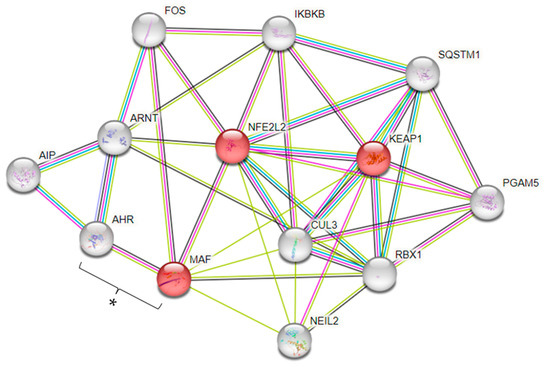 Protein–protein association network, using String (PPI enrichment p-value: 1.58 × 10−5). Network nodes represent proteins. Red nodes indicate genes involved in the NRF2-ARE regulation (WP4357). Edges represent protein–protein associations. Known Interactions—light-blue line: from curated databases; pink line: experimentally determined. Predicted Interactions—green line: gene neighborhood; red line: gene fusions; dark-blue line: gene co-occurrence. Others: yellow line: text mining; black line: co-expression; baby-blue line: protein homology. * Indicates the involvement between AHR and MAF genes.