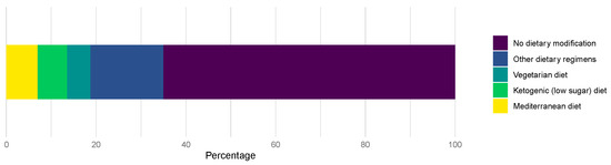 Furthermore, 101 (34.9%) patients reported dietary modification after diagnosis of mRCC. The Mediterranean diet was the most common (19.8%) newly adopted regimen among patients, followed by the ketogenic diet (18.8%%) (Figure 1).