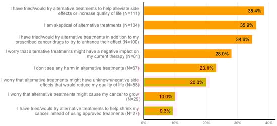Additionally, participants’ views toward alternative medicine were interrogated in this study. Notably, 111 patients (38.4%) indicated that they have tried or would try alternative medicine approaches to help alleviate the side effects of their systemic treatment or increase their quality of life. While 104 respondents (36.0%) were skeptical toward alternative medicine, 27 (9.3%) mentioned that they have tried or would try alternative medicine to assist their cancer shrinkage instead of using approved treatments. Detailed results of respondents’ views toward alternative treatment are presented in Figure 2.