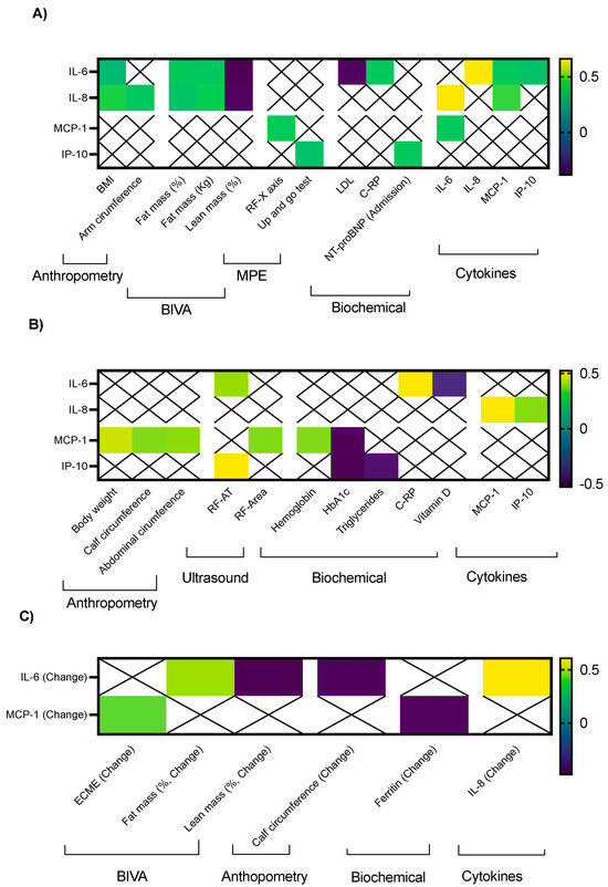 Significant clinical correlations between circulating cytokines, body composition and biochemical parameters in patients with HF: (A) clinical correlations observed at baseline; (B) clinical correlations determined after 24 weeks of nutritional intervention; (C) six months absolute changes. Legend: only significant correlations are presented. Color boxes represent the strength of the correlation according to the color scale represented on the right side of each figure. BIVA: bioimpedance vectorial analysis, MPE: morphofunctional evaluation; RF: rectus femoris; CRP: C reactive protein.