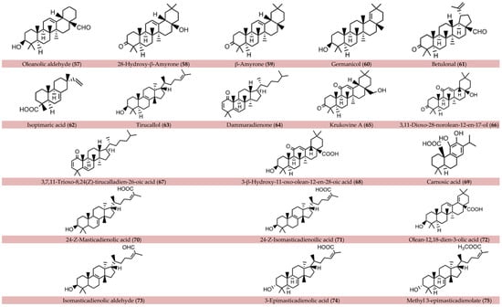 Kartalis et al. [20] described the main components of CMG being an insoluble polymer (25%) and a triterpenic fraction (67%), which is further subclassified into acidic (39%) and neutral (28%) fractions. The main components of acidic fraction are masticadienonic acid (50) (30%), isomasticadienonic acid (49) (30%), oleanonic acid (51) (15%) and moronic acid (47) (10%). The neutral fraction’s main components include butyspermol (55), tirucallol (63), oleanolic aldehyde (57) and betulonal (61). Another monoterpenic constituent of CMG is camphene (7), which also seems to possess promising hypolipidemic activity.