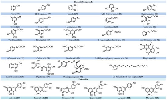 Furthermore, the oil extracted from fruits of P. Lentiscus (PLFO) is a rich source of phenolic compounds, with about 40 molecules identified, such as gallic acid (85), tyrosol (82), vanillic acid (86) and flavonoids such as kaempferol (101) and quercetin (103) [28]. The total phenolic content (TPC) and total flavonoid content (TFC) for PLFO were determined to be 25.19 ± 0.67 μg GAE/mg and 20.90 ± 4.41 μg quercetin equivalent (QE)/mg of PLFO, respectively. In the case of the unsaponifiable fraction (USM), the quantity of the TPC and TFC values was found to be 18.70 ± 2.89 μg GAE/mg and 12.5 ± 2.65 μg QE/mg of USM, respectively [28].