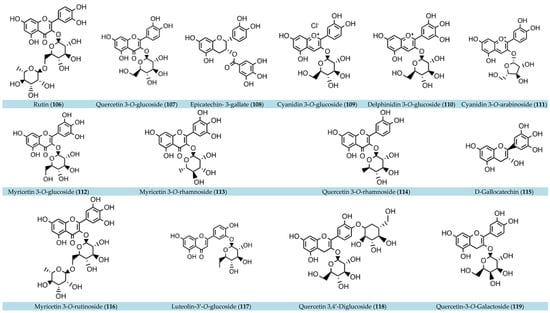 Aerial parts of fresh P. lentiscus collected in different areas of Sardinia showed that in the leaves, a large number of flavonoids are present, in particular members of myricetin (105, 113, 114, 120, 121) and quercetin (106, 107, 118, 119) [22].