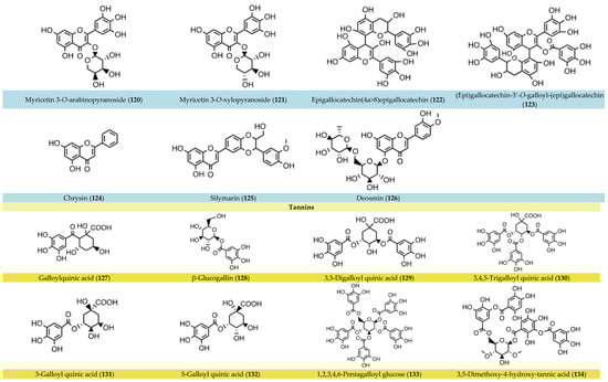 | Fruits | Gallic acid (85) Quercetin-3-O-rutinoside (rutin) (106) Quercetin 3-O-glucoside (107) Myricetin 3-O-glucoside (112) Luteolin-3’-O-glucoside (117) 3,5-Digalloyl quinic acid (129) 3-Galloyl quinic acid (131) 5-Galloyl quinic acid (132) 1,5-Digalloyl quinic acid (136) | |||||
