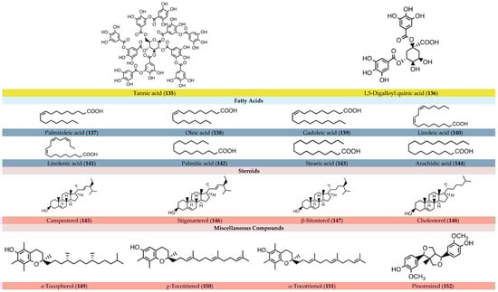 The steroid components (145–148) were identified in PLFO extracted from P. lentiscus fruits (85% dark and 15% red berries), which also contains, in addition to sterols, tocopherol (149), carotenoids and chlorophyll [29].