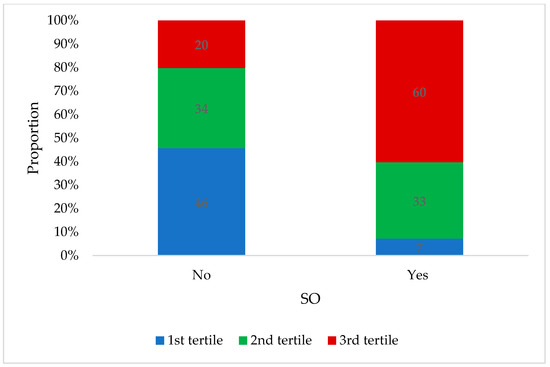 Distribution of participants across tertiles of VAT mass according to whether they are with or without SO (n = 256). VAT = visceral adipose tissue; SO = sarcopenic obesity.