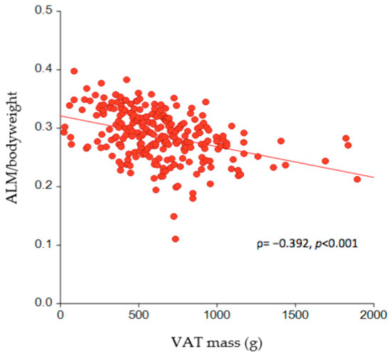 The association between VAT mass and ALM per kg of body weight in the study participants (n = 256). VAT = visceral adipose tissue; ALM = appendicular lean mass.