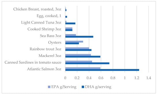 According to the National Institute of Health (NIH), adequate intakes of omega-3 PUFAs in those older than the age of 19 are 1.6 g/d in males and 1.1 g/d in females, with increased requirements for females during pregnancy and lactation [105,106]. In addition to food sources seen in Figure 1, omega-3s are available in dietary supplement form [105]. Doses have a wide variety; however, supplements typically provide about 1000 mg of fish oil, which contains 180 mg of EPA and 120 mg of DHA. Some supplements are provided in marine oil form, which is also a rich source of fat-soluble vitamins [107]. In particular, the liver oil of cod, haddock, halibut, shark, whales, and tuna are typically used to produce vitamins A and D, containing approximately 1000 and 10 IU/g, respectively. Omega-3s are presented in many different forms in supplements, including natural triglycerides found in marine oils, free fatty acids, ethyl esters, re-esterified triglycerides, and phospholipids. Supplements in the form of re-esterified triglycerides, natural triglycerides, and free fatty acids have been reported to have greater bioavailability than ethyl esters; however, consumption of any form of the supplement will enhance plasma EPA and DHA levels [105].