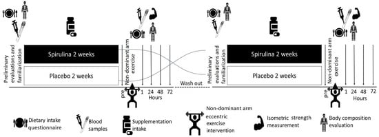A double-blind, placebo-controlled, randomized crossover design was used. The intervention consisted of two arms. In each arm, every volunteer was administered, in random order, either the spirulina supplement (SPI) or placebo (PLA) for 15 days before conducting an eccentric exercise protocol. The randomization was performed with an MS Excel algorithm creating a random sequence of numbers (i.e., 01001…). Participants were allocated to SPI/PLA (if 0) or PLA/SPI (if 1). They were asked to maintain their usual physical activity lifestyle and dietary habits during the entire period of the protocol. Upon completion of the spirulina or placebo intervention period, subjects visited the laboratory for 4 consecutive days. On the first day, a muscle-damaging eccentric exercise protocol was performed. Before the exercise protocol and 1, 24, 48, and 72 h after the completion of the protocol, ergometric measurements, subjective feelings of discomfort, and biological samples were obtained. The two arms were separated by a six-week washout period to avoid the carry-over effect of each supplementation period and the repeated bout effect of eccentric exercise. The experimental protocol was approved by the Ethics Committee of Harokopio University (Reg. No. 2759/16090-2019). The protocol was conducted in compliance with both Good Clinical Practices and the Declaration of Helsinki. All the participants were previously informed about the study objectives, as well as possible risks, discomforts, and benefits, before obtaining their written consent (Figure 1).