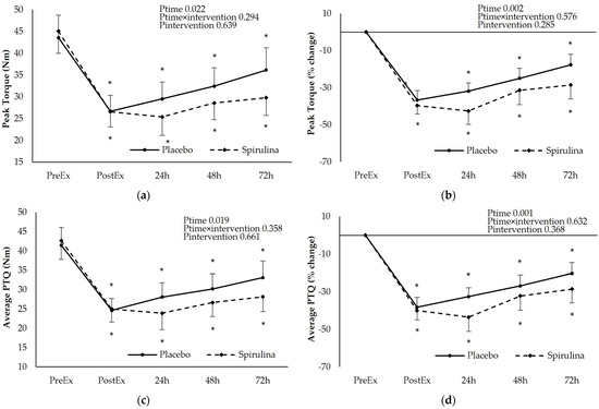 Effect of supplementation on the following: (a) peak torque absolute values (Nm); (b) peak torque % change; (c) average peak torque absolute values (Nm); (d) average peak torque % change. * p < 0.05 PreEx vs. PostEx, 24, 48, 72 h. Ptime: main effect for time; Ptime × intervention: main effect for time × intervention; Pintervention: main effect for intervention.