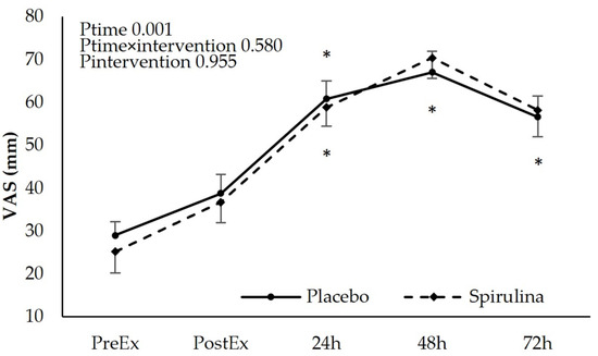 Effect of supplementation on perspective muscle discomfort (Visual Analogue Scale). * p < 0.05 PreEx vs. PostEx, 24, 48, 72 h. Ptime: main effect for time; Ptime × intervention: main effect for time × intervention; Pintervention: main effect for intervention.
