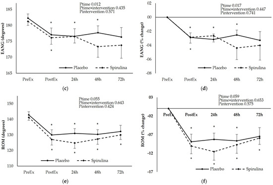 The FANG increased immediately after the exercise and remained elevated for 72 h post-exercise (13–22%). Spirulina supplementation did not affect the kinetics of the FANG increase. The EANG changed in an opposite direction showing a small but significant, sustained reduction until 72 h post-exercise. No effect of “intervention” or “time × intervention” was observed although a higher reduction in the EANG was observed at 48 and 72 h post-exercise. Finally, the change of the ROM was similar to that of the EANG showing sustained reduction in both arms of the study (7–10%). Despite the fact that spirulina supplementation did not affect the kinetics of the ROM change, a significantly higher reduction in the ROM was observed in the spirulina arm compared to the placebo 24 h post-exercise. Similar trends were observed when the iAUC between arms were compared for the FANG (PL: 41.7 ± 73.2 deg.h, SPI: 35.0 ± 22.7 deg.h, p = 0.766), EANG (PL: −16.5 ± 15.4 deg.h, SPI: −21.2 ± 26.5 deg.h, p = 0.509), and ROM (PL: −49.3 ± 34.9 deg.h, SPI: −50.5 ± 34.8 deg.h, p = 0.930).