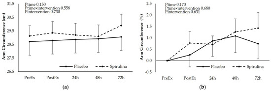 Effect of supplementation on arm circumference as (a) absolute values (cm) and (b) % change. p < 0.05 PreEx vs. PostEx, 24, 48, 72 h. Ptime: main effect for time; Ptime × intervention: main effect for time × intervention; Pintervention: main effect for intervention.